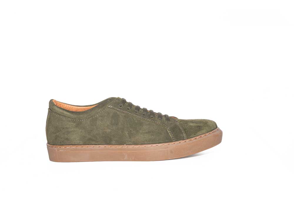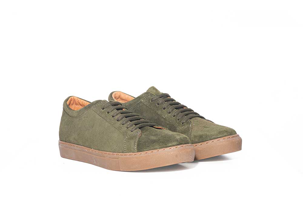 versión de gamuza verde oliva es una zapatilla urbana de líneas limpias, confeccionada 100% a mano